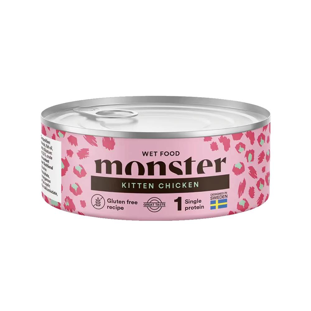 Monster Cat Kitten Chicken ei ole pelkkä herkku, vaan täysipainoinen ja ravinteikas säilyke, joka tukee kissanpennun kasvua, hyvinvointia ja nesteytystä.